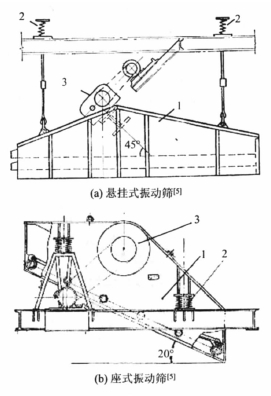 圖1( a) 為掛式振動(dòng)篩,圖1( b) 為座式振動(dòng)篩。 篩箱與水平面的傾角為15° - 20°,上面固定有篩網(wǎng)和激振器,篩面可以是單層或多層。篩箱通過彈簧 懸掛或安裝在機(jī)架上。電機(jī)通過皮帶傳動(dòng),帶動(dòng)固定于篩箱上的激振器,從而使篩箱產(chǎn)生振動(dòng)而工作。
