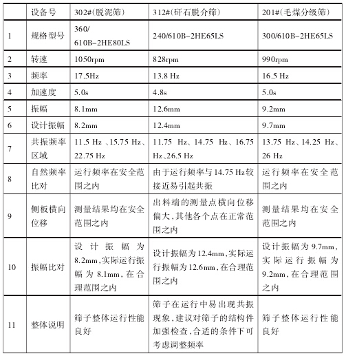 選煤廠重介末矸脫介篩規(guī)格型號為 BRU-1-240/ 610B-2HE65LS,在設(shè)備啟停過程中,明顯感覺篩箱振幅較大, 現(xiàn)場目測振幅大約在13mm,2009年下半年篩子的一根支撐彈簧斷裂。2010年5月公司相關(guān)部門技術(shù)人員到選煤 廠對302#脫泥篩、312#矸石脫介篩和201#毛煤分級篩進(jìn)行了一 次全面的結(jié)構(gòu)技術(shù)測評,測評數(shù)據(jù)與整體說明統(tǒng)計如下