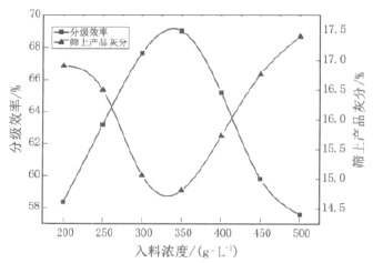 圖 2 分級(jí)效率及篩上產(chǎn)品灰分隨煤漿濃度變化的關(guān)系圖