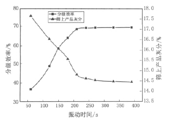 圖 3 分級(jí)效率及篩上產(chǎn)品灰分隨振動(dòng)時(shí)間變化的關(guān)系圖