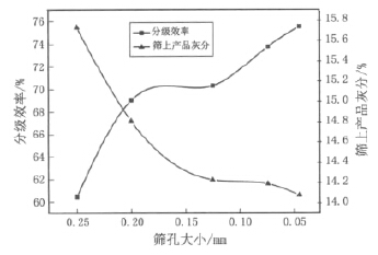 篩孔大小對(duì)分級(jí)效率及篩上產(chǎn)品灰分的影響規(guī) 律見(jiàn)圖 4。