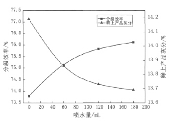 由圖 5 中可以看出,隨著噴水量的增加,分級(jí) 效率逐漸變大,篩上產(chǎn)品灰分逐漸降低,但變化都 有變緩的趨勢(shì)。這是因?yàn)樵诤Y分過(guò)程進(jìn)行時(shí),只是 增加噴水量對(duì)篩上物料的松散分層沒(méi)有太大的影 響,必須要有持續(xù)的噴水。正如德瑞克細(xì)篩配置有 1 ~ 3 個(gè)洗礦槽,為使前一篩網(wǎng)已脫水的篩上產(chǎn)品 在洗礦槽再造漿,噴淋裝置直接向洗礦槽噴水,可 以使篩上物在洗礦槽重新造漿,固體顆粒徹底翻轉(zhuǎn) 和碎散,再經(jīng)篩分使粗、細(xì)物料分離 [15] 。電磁高 頻細(xì)篩是通過(guò)擊打篩網(wǎng)使物料松散,在有持續(xù)噴水 的條件下,在篩面上即可完成重新造漿,使粗、細(xì) 物料分離開來(lái)。
