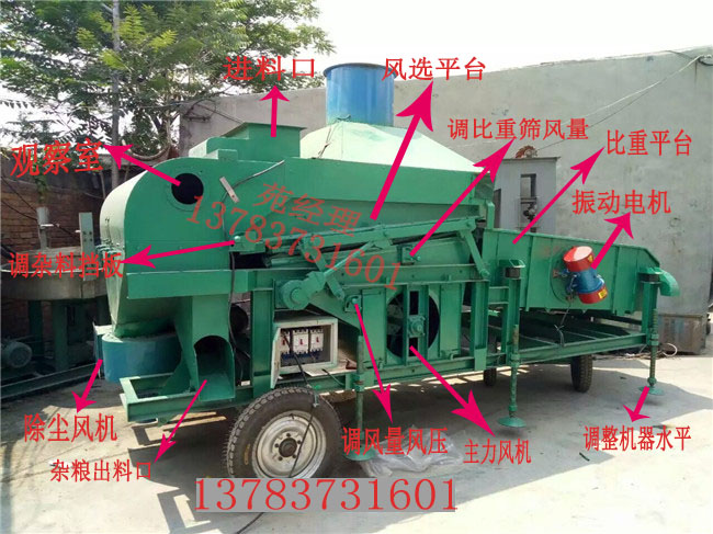 3、在機器的右側有3個手柄,分別是調節(jié)雜料擋板、調節(jié)風量風壓和調節(jié)比重篩風量使用的,首先我們要先了解它們各自的用途是什么?調節(jié)雜料擋板是用來控制雜糧多少的,調節(jié)風量風壓是用來控制風壓的大小,調節(jié)比重篩風量是用來控制風力方向的。